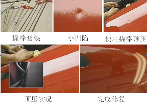 對于鋁板上的小凹陷,可以使用日照燈尋找凹陷點,再用撬棒頂壓法,從板件內(nèi)側(cè)慢慢往外頂,但要注意不能過度頂壓,如圖1-91所示為撬棒頂壓法實例圖。