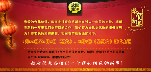 2014年春節(jié)放假通知 2014-01-16 10530 親愛的合作伙伴,珠海龍神衷心感謝您在過去一年里的支持,期望在新的一年里我們更密切的合作,我們將為提供更優(yōu)質(zhì)的服務(wù)而努力!春節(jié)長(zhǎng)假即將來臨,我司春節(jié)放假通知如下:1月26日至2月8日(初九),2月9日(星期六)正式上班。特別提示貨運(yùn)公司將于1月25日后停止發(fā)貨,如需訂貨請(qǐng)于1月25日前傳真至0756-8509650,謝謝您的合作!最后祝愿各位過一個(gè)祥和快樂的新年!