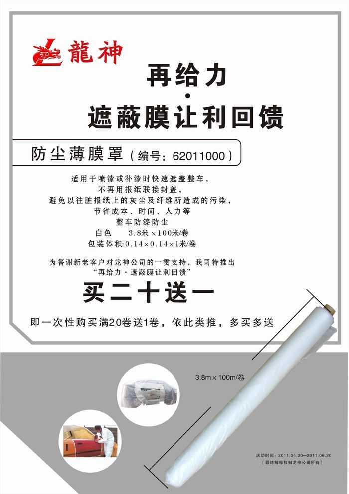 2011年4月再給力·遮蔽膜讓利回饋促銷! 2011年4月再給力·遮蔽膜讓利回饋促銷! (活動已結(jié)束,感謝您的關(guān)注) 一、活動主題: “再給力,遮蔽膜讓利回饋” 二、活動時間: 1、時間:2011年04月20日至2011年06月20日 2、時長:共計2個月 三、促銷產(chǎn)品: 防塵薄膜罩 尺寸3.8米*100米/卷 龍神編號:62011000 買20送1 ,一次性購買滿20卷送1卷,如此類推,多買多送。 2011-04-19 12187