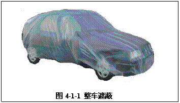 汽車修補噴涂時,為了保護(hù)修補部位以外范圍不受漆霧、灰塵的污染,因此就要對非修補區(qū)域進(jìn)行覆蓋保護(hù),這就是所謂的遮蔽。遮蔽是非常重要的工作,所有部分修補涂裝(包括點修補、點擴(kuò)展修補和區(qū)域修補)在噴漆前,都要對噴涂區(qū)域周圍的區(qū)域進(jìn)行遮蔽保護(hù),修補面積較大或點較多時還需進(jìn)行整車遮蔽(如圖4-1-1)。有時在清除修補區(qū)域舊涂膜的作業(yè)和研磨、拋光等作業(yè)時也需要對相關(guān)部分進(jìn)行遮蔽保護(hù)。