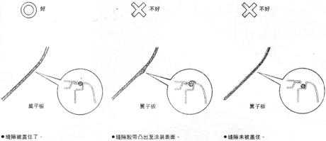 注 意:如果一個遮蔽區(qū)域使用了密封條,則遮蔽材料必須在密封條剛干以后,趁其還是熱的時候就要剝除。如果遮蔽密封條的材料在密封條冷了以后才剝除,那么密封條就會變形,并且難于恢復(fù)至原形。