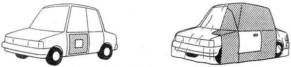 實際維修工作中所要遮蔽區(qū)域面積的大小,與所用的噴涂方法、噴槍的走槍方式、漆霧的散射范圍等都有密切關(guān)系,另外點修補噴涂和塊修補噴涂所用的遮蔽方法也不相同。因此,實際遮蔽工作中必須根據(jù)情況確定恰當(dāng)?shù)恼谏w范圍,盡量保證在每一種情況下遮蔽的面積最小(如右圖4-3-2)。
