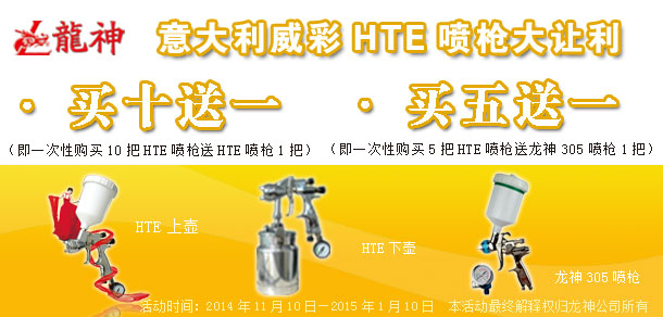 2014年11月吉尼斯HTE噴槍"初冬.讓利"大促銷 2014-11-11 16530 活動內容: 1、買十送一(即一次購買十把HTE噴槍送一把HTE噴槍) 2、買五送一(即一次購買五把HTE噴槍送一把龍神305噴槍) 活動期間HTE上下壺噴槍的贈送方式為:以多贈送原則(如:買6把上壺+4把下壺,贈送上壺。反之亦然,以此類推。)