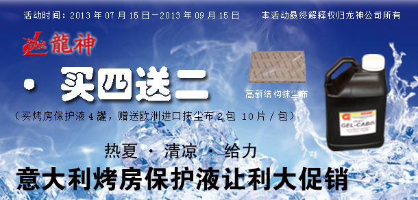 "熱夏 清涼 給力" 意大利烤房保護液讓利大促銷! 2013-07-16 25199 "熱夏 清涼 給力" 意大利烤房保護液讓利大促銷!活動時間:2013年07月15日至2013年09月15日。 時長:共計2個月