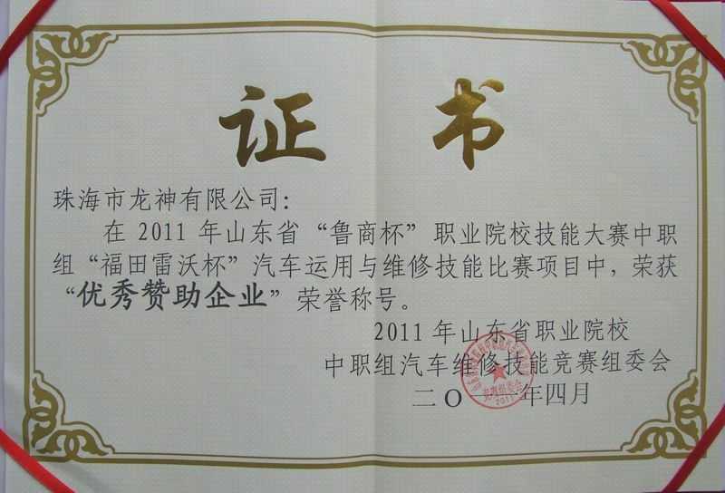 4月7日,在「2011年山東省“魯商杯”職業(yè)院校技能大賽」中職組“福田雷沃杯”汽車運(yùn)用與維修技能大賽項目中,我司榮獲“優(yōu)秀贊助企業(yè)”榮譽(yù)稱號。