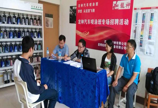 珠海龍神有限公司攜手昆明松騁汽修設備有限公司與昆明市官渡區(qū)職業(yè)高級中學建立更深層次的校企合作關系,開辦龍神噴涂班?,F(xiàn)場選拔面試會已于2014年6月24日在昆明市官渡區(qū)職業(yè)高級中學隆重舉行!